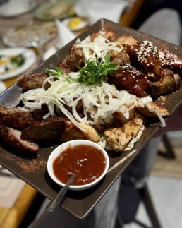 | “М’ясне плато” (шашлик з ошийка, шашлик курячий, реберця барбекю, люля-кебаб, соус) | 1000 | 1550 |